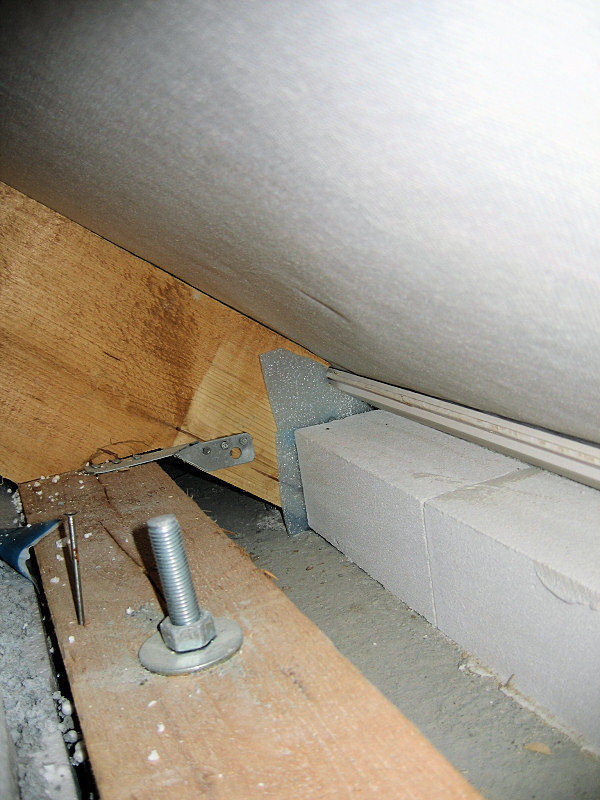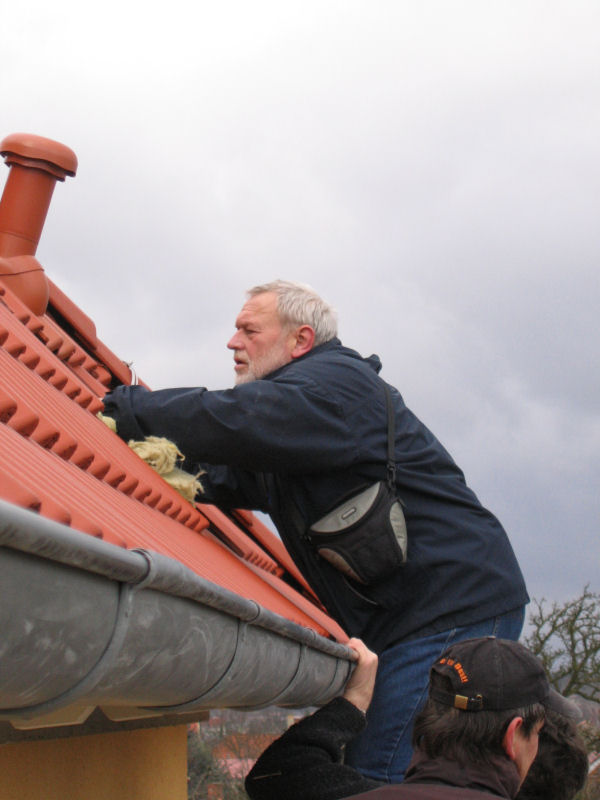 Das fehlende Isolationsmaterial vorrangig in den Ecken und im Bereich, wo der Dachstuhl auf die Betondecke aufsetzt, wird in einer ersten Aktion mit Mineralwolle gedämmt.
