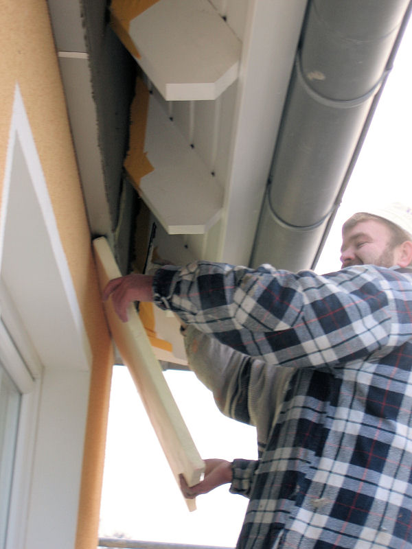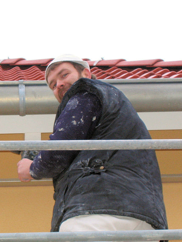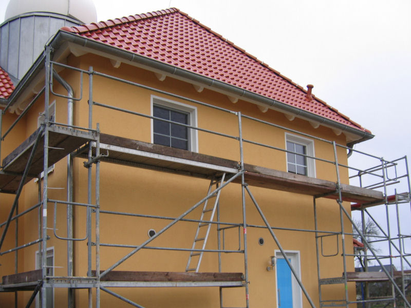 Im dritten Anlauf hat man dann auch den richtigen Farbton des Giebelputzes getroffen.