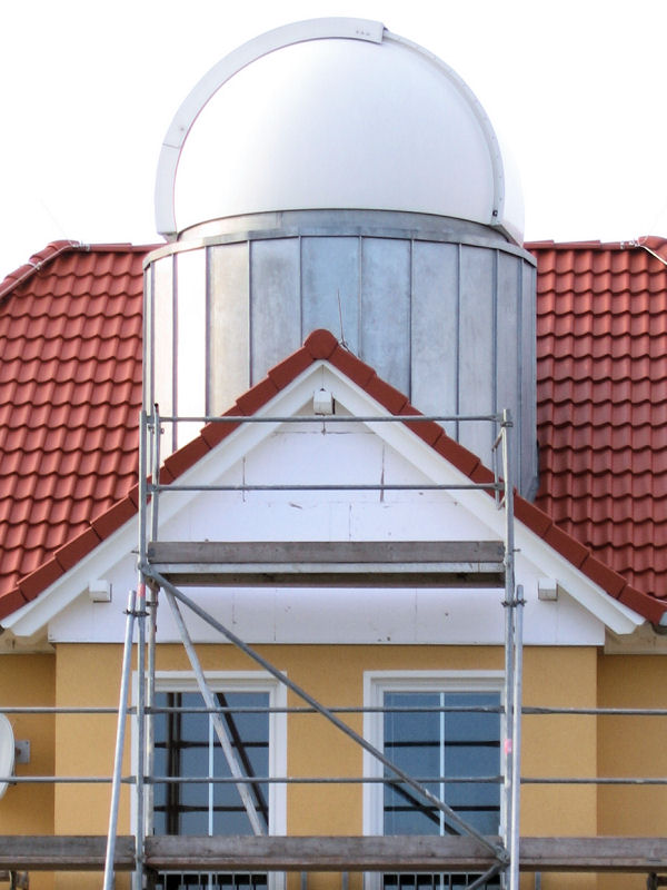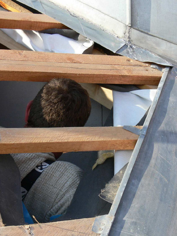 Der Dachgiebel wird komplett eingepackt. Das Dach muss teilweise geöffnet werden, um das Isolationsmaterial in die Ecken und hinter den Kuppelrundbau zu bekommen.