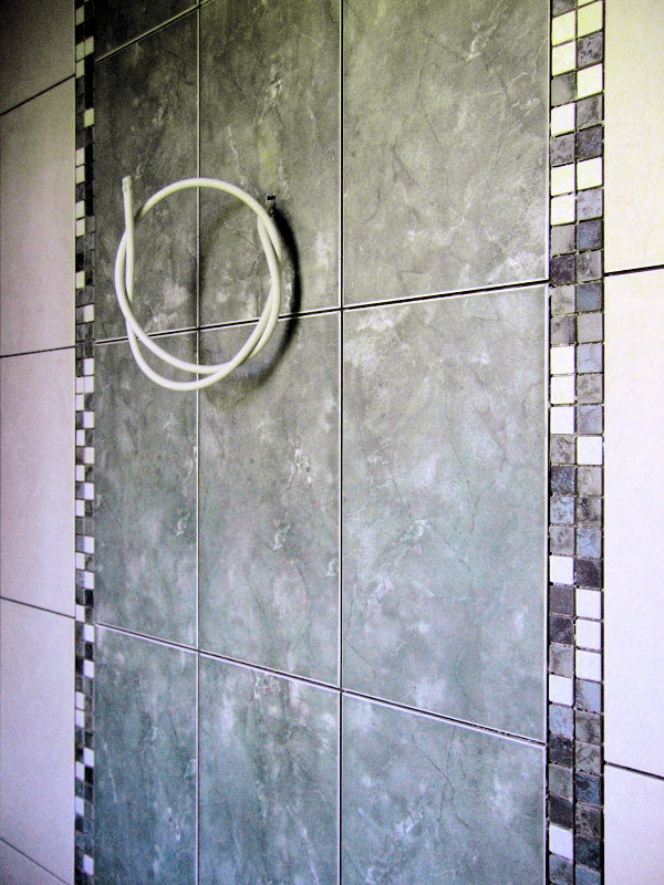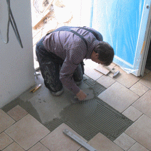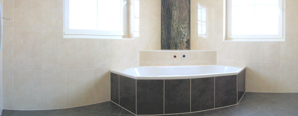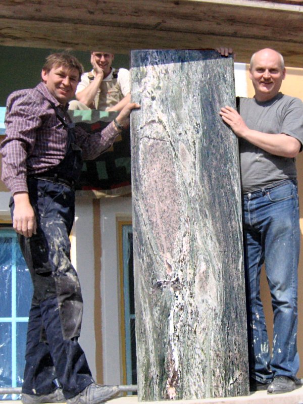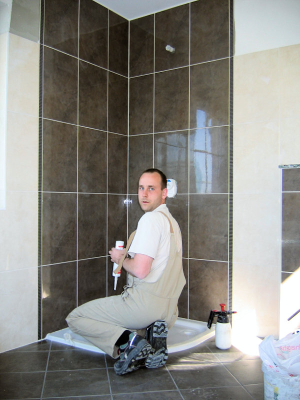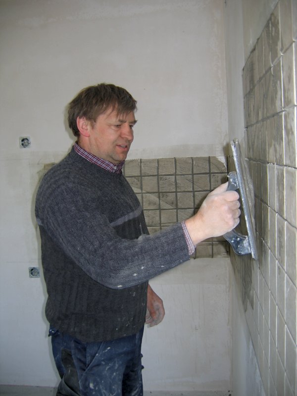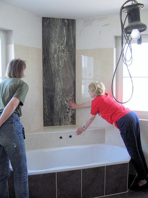 Verfugen des Fliesenspiegels in der Küche Natursteinplatte fürs Bad wird rein gehievt